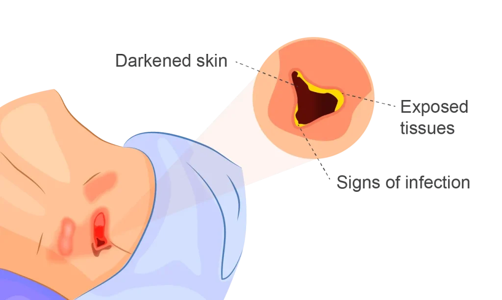 Bedsores — also called pressure ulcers and decubitus ulcers — are injuries to skin and underlying tissue resulting from prolonged pressure on the skin. Bedsores most often develop on skin that covers bony areas of the body, such as the heels, ankles, hips and tailbone.